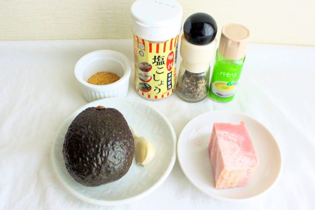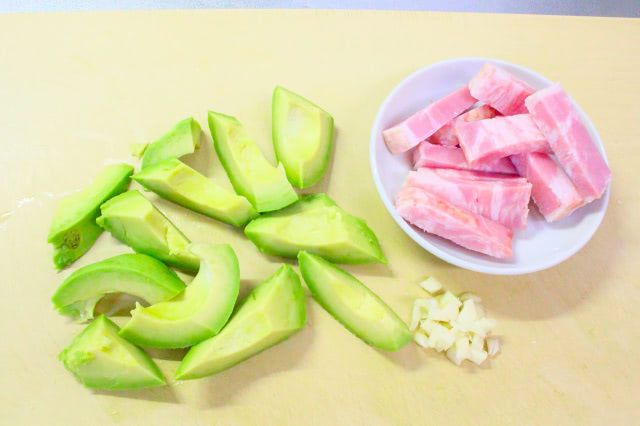 1. 種と皮を取り除いたアボカドを、大きめにカットします。にんにくは粗みじん切り、ベーコンは拍子木切りにします。