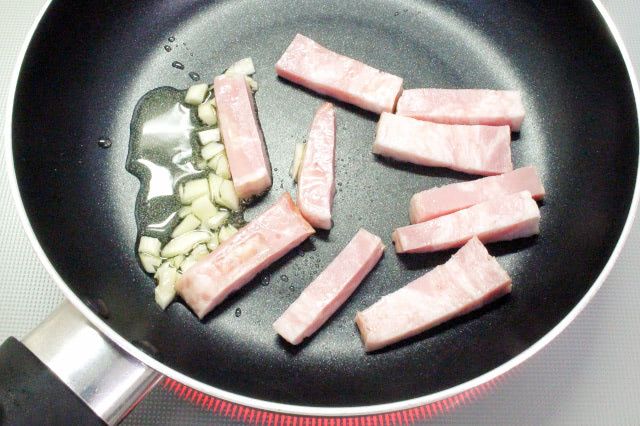 2. フライパンに油を引いて中火で熱し、にんにくとベーコンを炒めます。