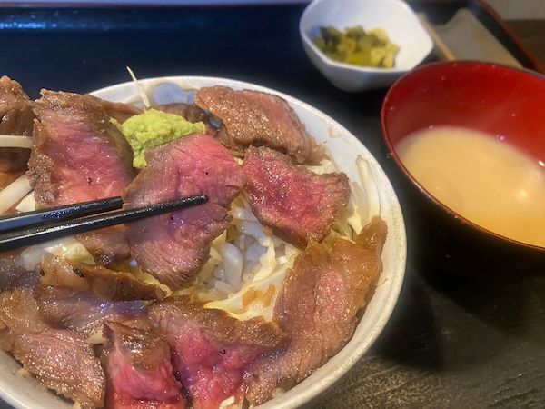 運ばれてきたステーキ丼は、ご飯の上にキャベツ、その上に和牛が艶やかに並び、わさびが添えられた一品。肉は柔らかく、噛むほどに旨みが広がります。
