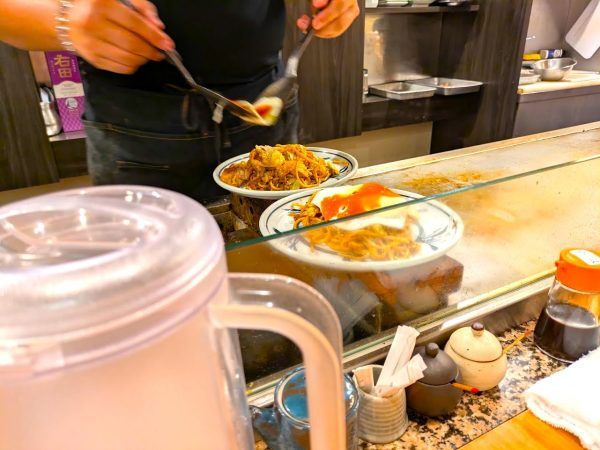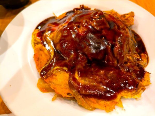 鉄板ライブを見ていると、卵の入った料理が食べたくなってきました。こちらのオムレツは小さいボウルの中に卵を2個入れて、コテでスゴいスピードでかき混ぜます。オムレツの中には、炒めた豚肉と玉ねぎが入っています。なるほど、豚肉と玉ねぎで肉玉オムレツなんですね!そうかぁ、玉ねぎかぁ。そうだ、そうだ、お好み焼きと勘違い。(笑)