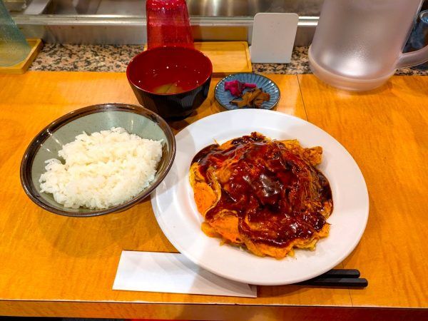 肉玉オムレツ定食は、肉玉オムレツ・ご飯・漬物・汁物付きです。