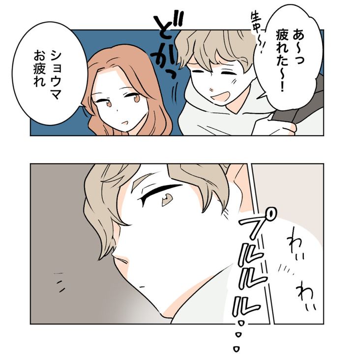 「あ~っ疲れた~!」と言いながら、ショウマは当然のように、カエデの隣に座りました。カエデも「ショウマお疲れ」と、ショウマの隣にいるのが自然な感じです。しばらくすると、ショウマのスマホが鳴りました。