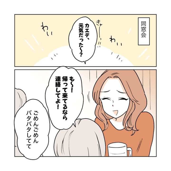久しぶりに地元に戻ったカエデのために、プチ同窓会が開かれ、私は夫と一緒に参加しました。久しぶりに高校時代の同級生が集まり、みんな楽しそうです。「も~!帰ってきてるなら連絡してよ!」という地元の仲間に笑顔で「ごめんごめんバタバタしてて」と答えるカエデ。私も、カエデが帰ってきていたなんて全然知らなかった。カエデは誰にも言っていなかったようです。