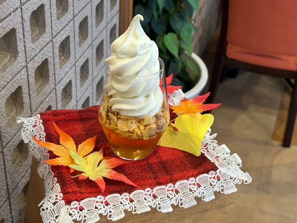 ソフトクリームの下にあるりんごのゼリーの甘さと酸っぱさのバランスが良く、ソフトクリームとの間にコーンフレークがあります。滑らかなソフトクリームとサクサクのコーンフレーク、冷凍されたシャリシャリのりんご…一つのパフェで様々な食感を楽しめます。 また、何よりソフトクリームが美味しい! こだわりの北海道産のソフトクリームがとても甘くて、手が止まらないです。