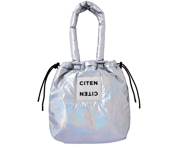 ストッパー付きドロストタイプの開口部で荷物の中身が見えない仕様。シャイニーなシルバーカラーは意外とどんなコーデにも合わせやすい。