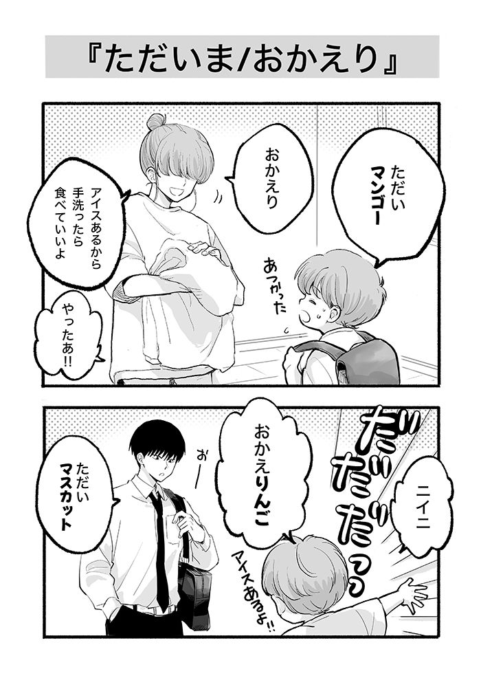 2. 「おかえりんご」「ただいマスカット」楽しそうな兄弟の挨拶に、私もと参加した母。その結果…【ぼくのニイニは高校生・45】