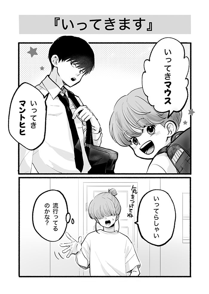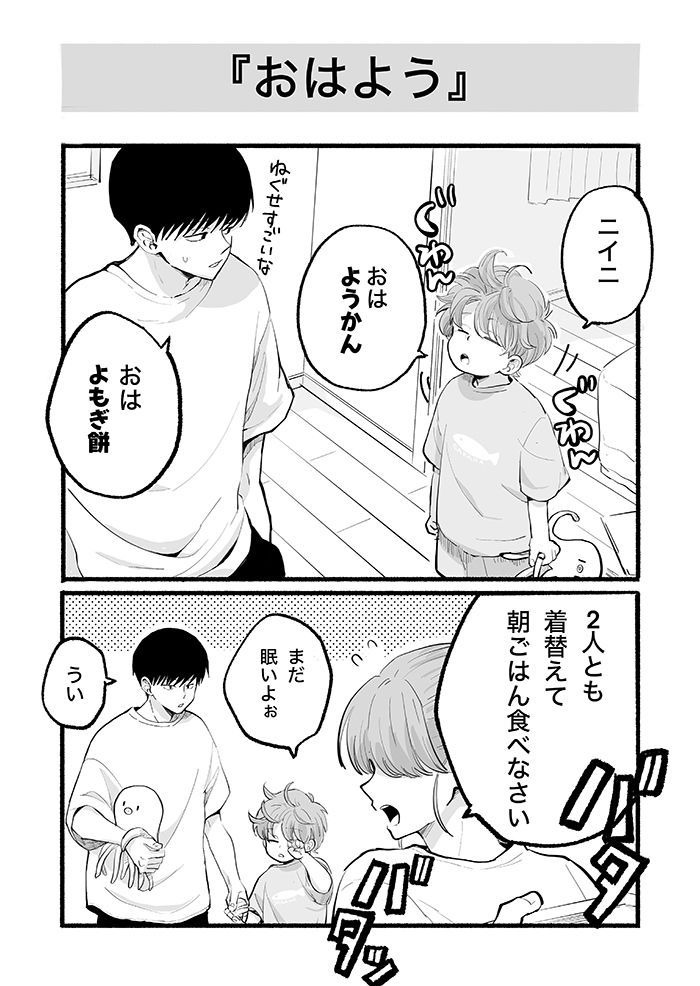 10歳差兄弟のニイニとオトト君。16歳のニイニは弟思いの優しいお兄ちゃんだけど、思春期まっただなかの高校生でもあり……。今回は兄弟がかわす楽しそうな挨拶のお話です。