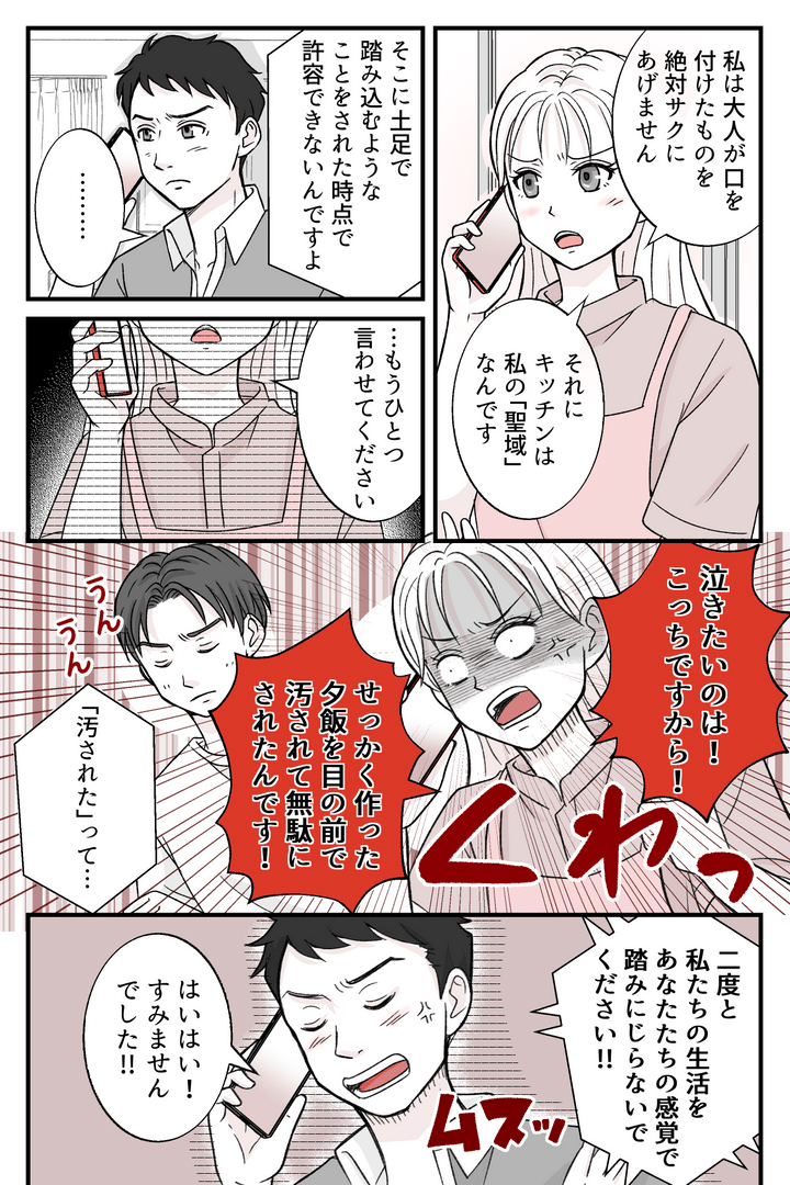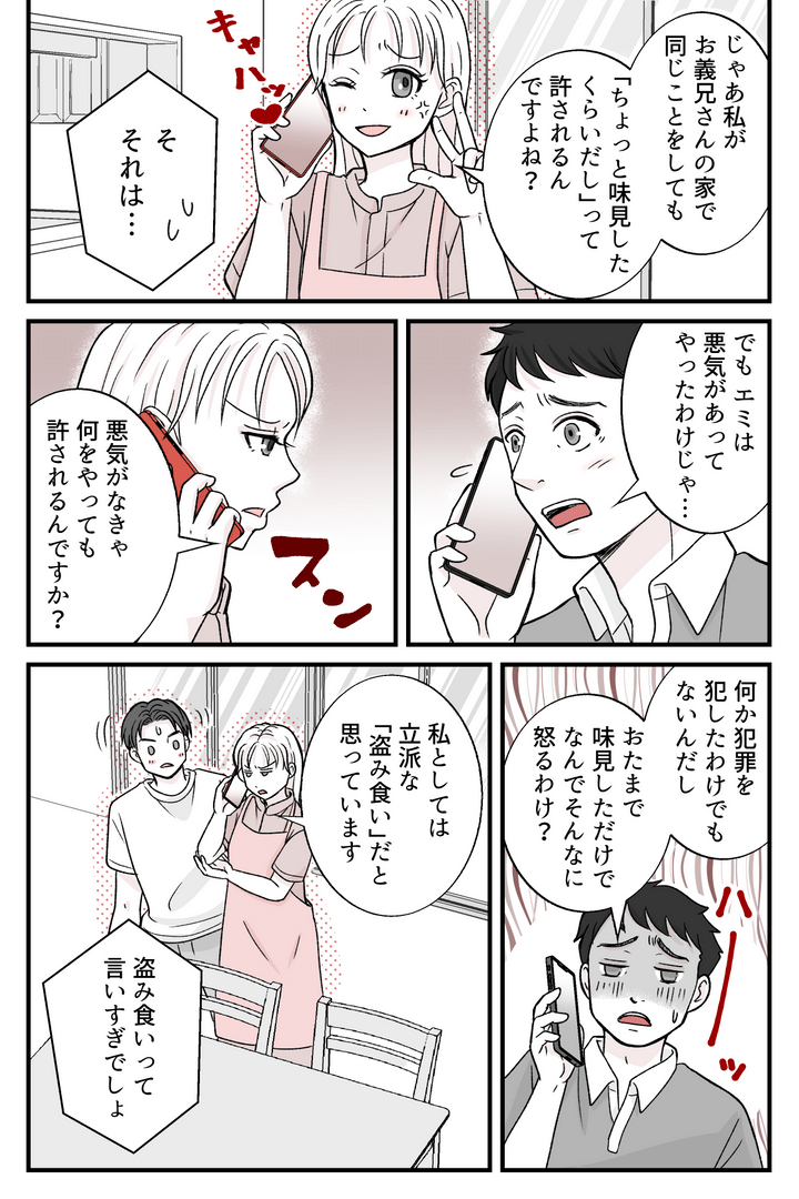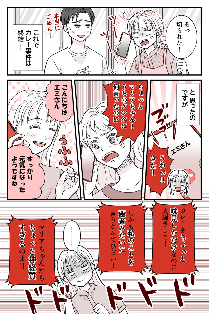 義兄との電話でカレー事件は終結、と思ったのですが……直後に今度はエミさんから電話がかかってきました。自分は被害者だと主張するエミさんの言い分では、「ちょっと味見しただけ」であり、私が「神経質すぎる」のだそう。そもそもの価値観が違うのだということを、エミさんには理解してもらいたいと思います。