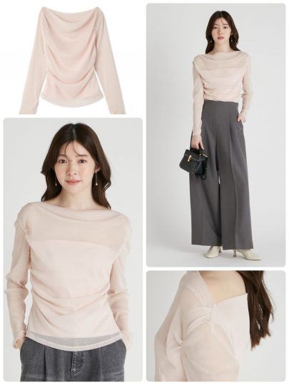 アシンメトリーのタックデザインとウエストのギャザーにより、ニュアンスのあるシルエットが完成するチュールトップス。袖口のゴムでくしゅっとギャザーを寄せて、柔らかな印象に仕上げました。ベア型の裏地が付いているためさっと1枚で着られます。伸縮性がある素材は、肩を落とすオフショルダーもスムーズ。