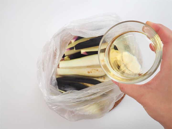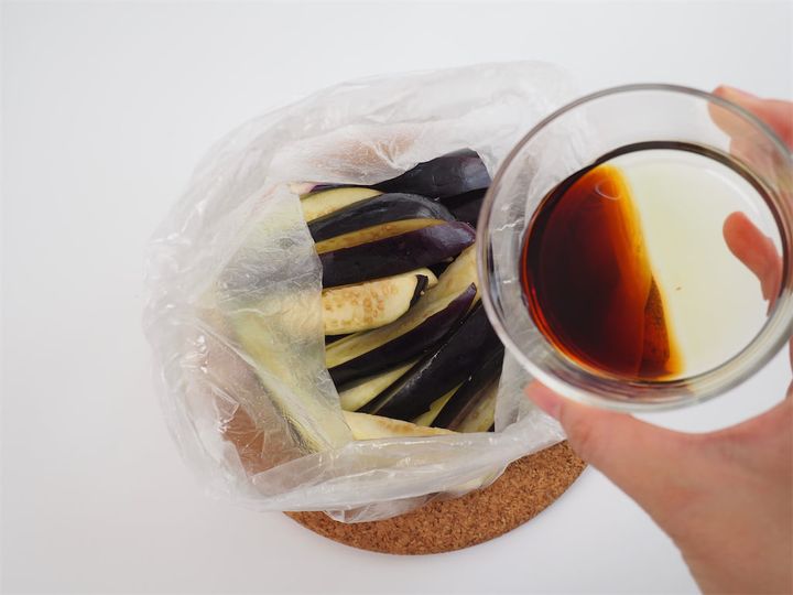 ポリ袋の口を閉じ、軽く振るようにしてまぶします。先に油をまとわせることで、後の調味料が均一になじみ、とろっとしたなすに仕上がるポイントに。