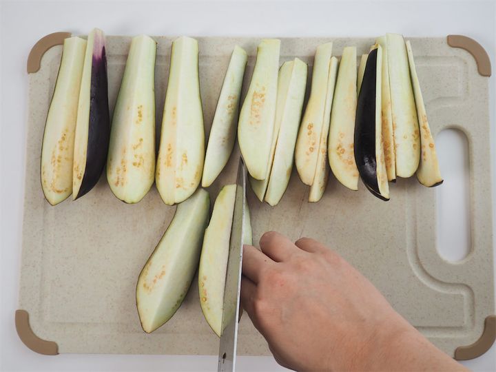 1. なすのヘタを取り、4等分、または8等分に切る。
