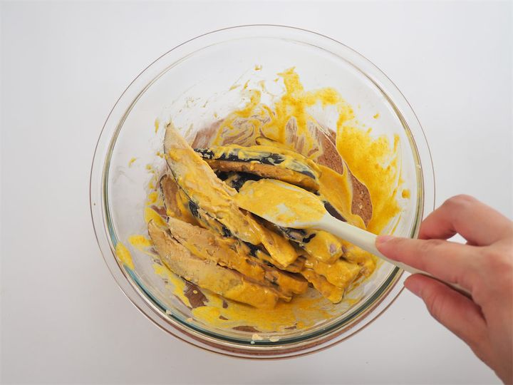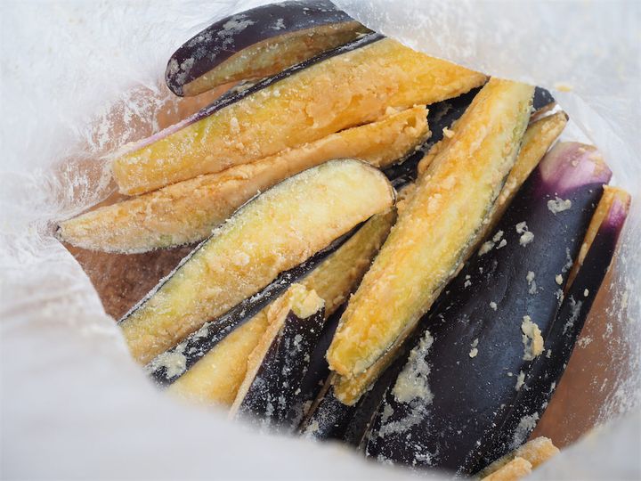 衣をつけるときは、ただまぶすのではなく、なすに“なすりつける“ようにシリコンベラでしっかり絡めるのがコツだと実感しました。多少マダラになってもOK。それがまた、香ばしさや食感の変化という醍醐味を生みます。