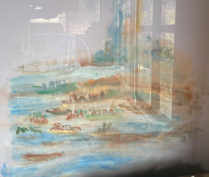 初めてシーツに描いた絵。この人を絵描きに戻す。その一心でした。子どもたちや介護のプロの方々にもたくさん協力していただきました。