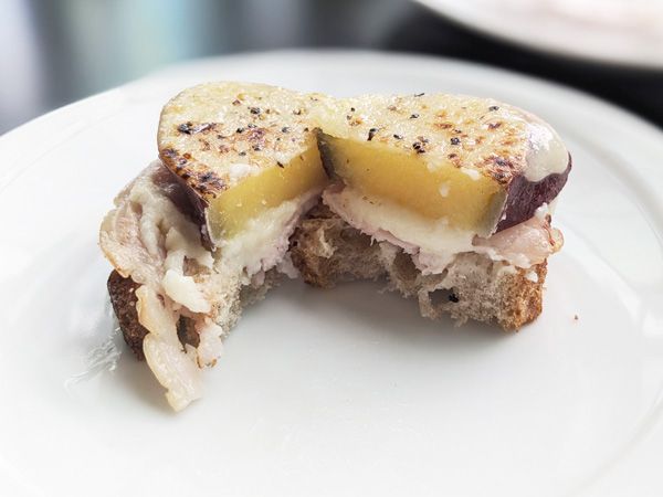 糖度14度以上になった紅はるかと、豚のモモ肉のハム(ジャンボン)を使った「ハチミツ芋とジャンボンのクロックムッシュ」は、上にグリエールチーズが乗せてあり、パンやベシャメルソースと層になっています。甘味と塩味が溶け合う、計算された味わいです。