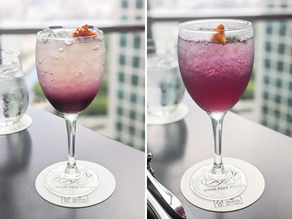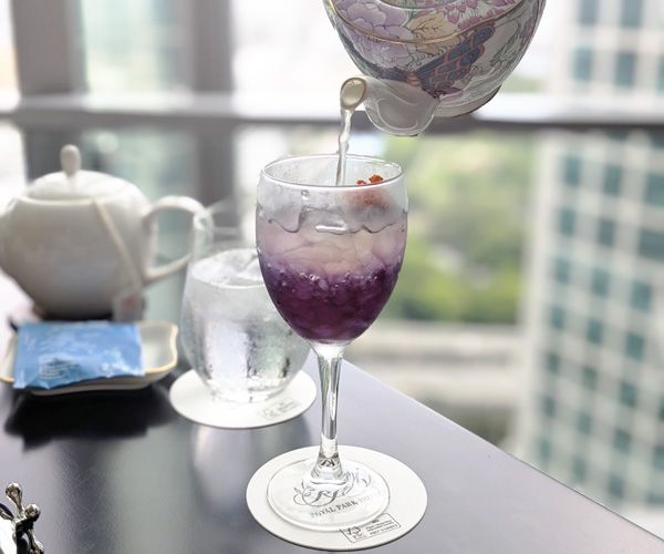 バタフライピーシロップに「SIROCCO TEA」のジンジャーレモンドリームとフレッシュレモンジュースを注ぎ、目の前で美しい2層のセパレートアイスティーを仕上げてくれます。