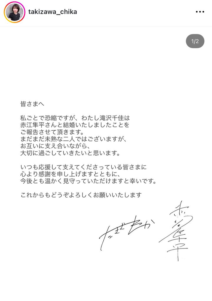「わたし滝沢千佳は赤江隼平さんと結婚いたしましたことをご報告させて頂きます」