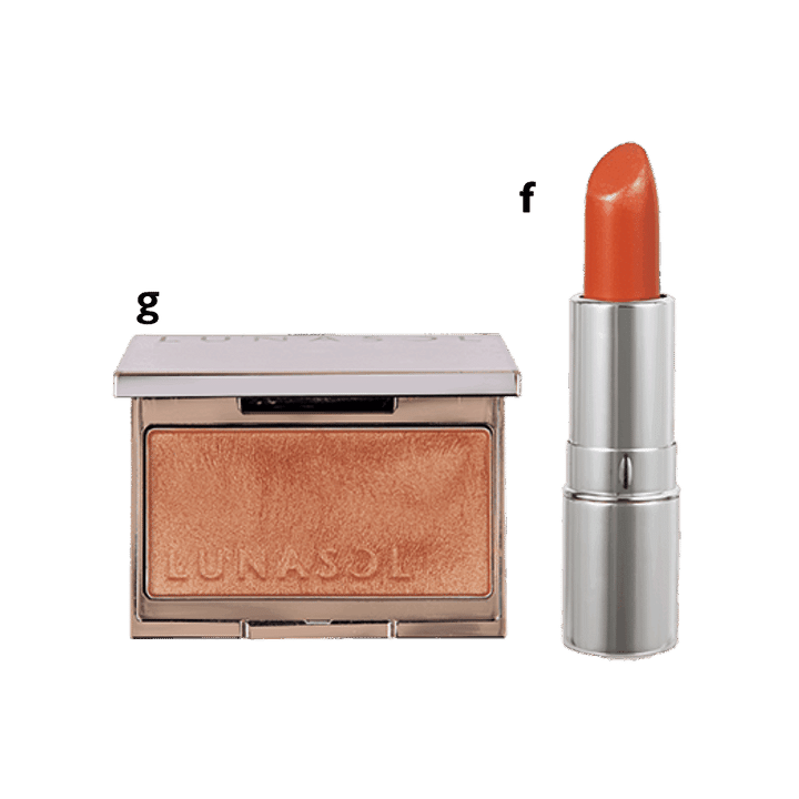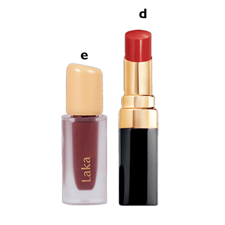 ピンクのチークになじむような、dのリップを唇全体に塗る。eで唇の輪郭をなぞるように丸みをつけて塗り、大人可愛い印象に仕上げる。