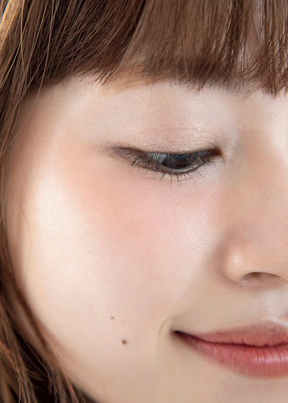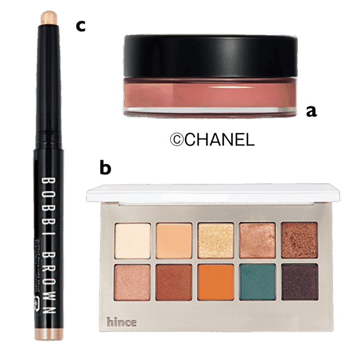 cを指でなじませてアイホールに広げ、色を入れずに印象的に見せるためbのベージュ系カラーを二重幅に重ねる。aは頰高めの位置に広く横長にのせ、内側から滲むような血色とツヤを出す。