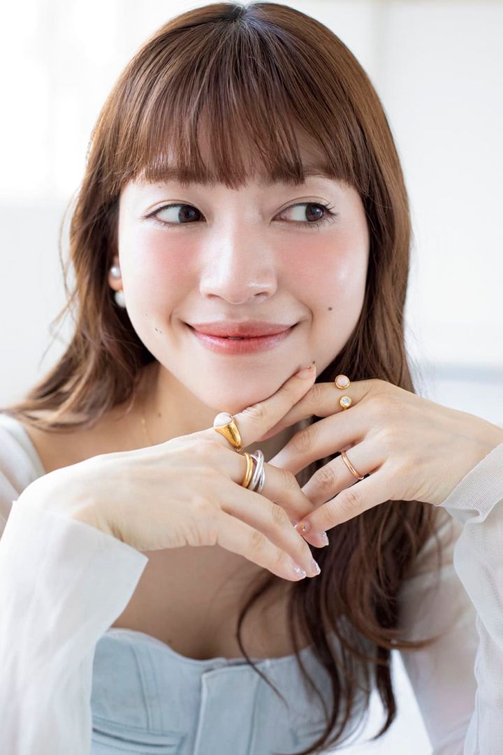 「イエベ春なのでチークはオレンジみのあるピンク、もしくはブラウンみのあるオレンジで顔印象をコントロール。ただ、子どもっぽく可愛らしく見え過ぎないように、チークをのせる位置や身に着けるジュエリーとのバランスを調節して大人に引き寄せます。ジュエリーは基本的に、デザインも色もMIXして自由に飾るのが私らしいスタイルです。」