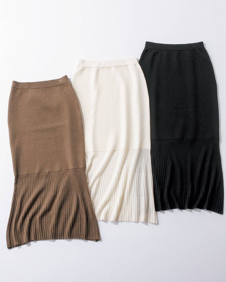 薄手のニット素材で仕立てたフレアスカートは、ひざ下からほんのり透けるシアー切り替えがポイント。ウエストはリブ仕様で穿き心地も抜群。オン・オフ問わず活躍する。