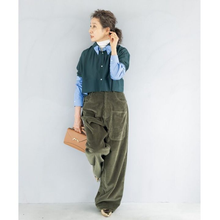 暦のうえでは立秋が過ぎましたが、まだまだ残暑が厳しい日々。昨年同様、長い夏が続いているなか、ファッション界は秋へと移行しています。 素材でいえば、コーデュロイは秋の訪れが待ち遠しくなるもののひとつ。やさしくてチャーミングなイメージですが、ときに素朴さが強まることがあるので、モード感やエレガントさが漂うスタイリングを心がけたいところです。 コーデュロイの特徴といえば、表情豊かな凹凸感。畝の幅によって印象が変わりますが、着用したグリーンパンツは太めで存在感があり、どちらかというとカジュアルな雰囲気。とはいえ、ほのかな光沢のある上質な生地なのでラフになり過ぎません。地厚なのにとてもやわらかく、心地よくはくことができます。 コーディネーしたのは、股上が深いワイドシルエットと好バランスなクロップド丈のシャツ。ブルーのボタンダウンとシルクのグリーンシャツを重ねたような遊び心のあるデザインも、大きなポケットを配したシンプルなコーデュロイパンツが受け止めてくれます。 どちらも、イタリアブランドの「メゾンジェジア」のもので、異素材の組み合わせや手の込んだディテールが魅力的。小物は、ラグジュアリーな「モワナ」のバッグやゴールドのフラットシューズを選んで、レディライクに仕上げました。