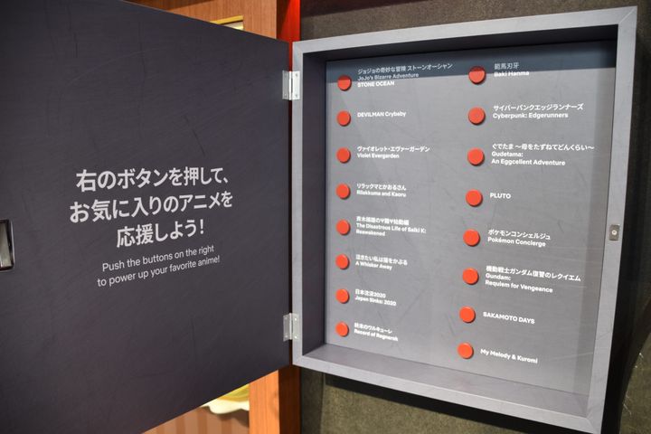 押してみると、それぞれのアニメに登場するキャラクターによるセリフが流れる仕掛け。どんなセリフかは、ぜひ実際に足を運んで確認してみてほしい。