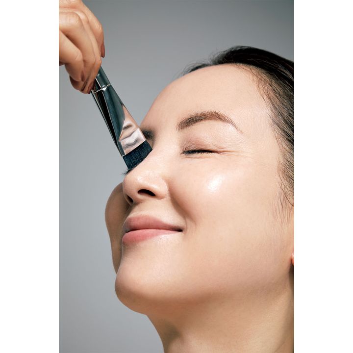 2.額や鼻筋、あご先などの顔の中央部分は、ファンデーションをつけ足さずブラシに残った液を薄く塗ります。皮脂が出て崩れやすい部分はなるべくのせる顔料は少なめに。
