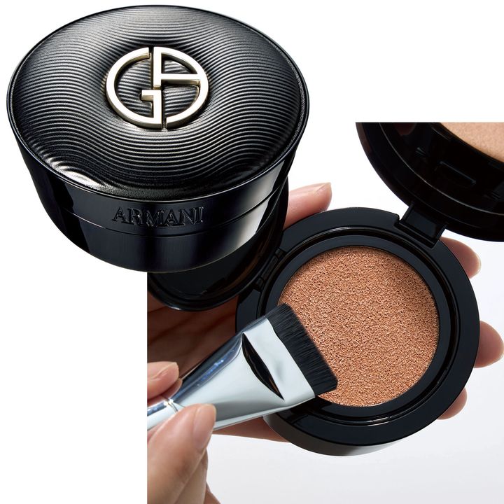 筆先でスポンジ面をプッシュして液をしっかりと含ませ、ブラシで外側から内側に塗ります。右・マイクロパールピグメント配合。光の反射でくすみをとばし洗練されたツヤ肌へと導きます。ルミナス シルク プリマ グロー 全4色 ¥12,540(アルマーニ ビューティ)