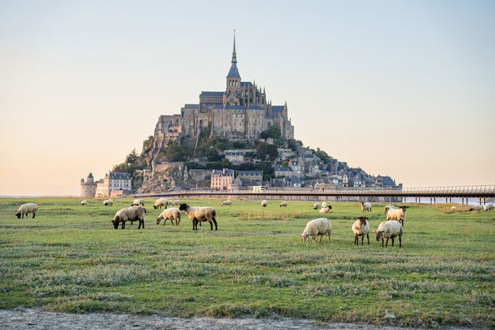 すると、徐々に朝日が後ろから上がってきて、モンサンミッシェルを徐々に照らし始めました。そのタイミングを待っていたかのように続々と羊たちも登場し、私が見たかった景色はもう目の前に。