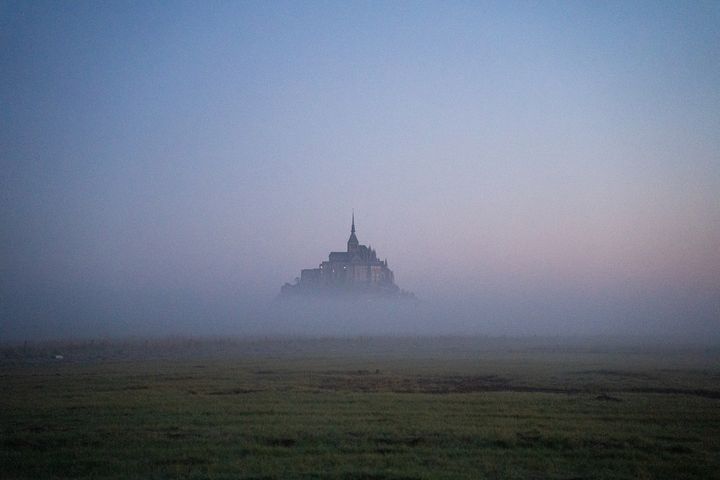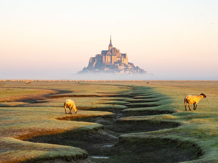 どの時間帯に訪れても堂々たる姿で聳え立つ、モンサンミッシェル。まさに絶景という言葉がぴったりです。その中でも写真に収めたかった景色があります。それは、モンサンミッシェルとうねうねの水路、羊、そして朝焼けのコラボレーション。