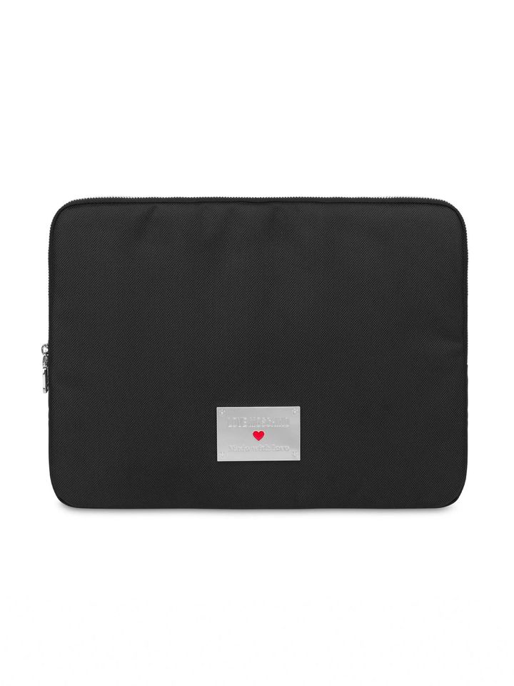 ラブ・モスキーノ(LOVE MOSCHINO)のPCケースは、キャンバス風の生地にシルバーファスナーとロゴプレートをあしらい、シンプルながらも大人っぽデザイン。カジュアルシーンとビジネスシーンのどちらでも使いやすいはず。