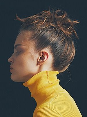 「鮮やかなイエローニットを大人っぽくシャープに見せるべく、一つ結びの位置は頭のてっぺんではなく、やや後ろ位置に。そうすると自然と目尻が後ろに引っぱられて、表情までもキリッとしたものに。はっきりとしたアイブロウや強めのアイメイクがよく似合うようになります」(塩沢さん)