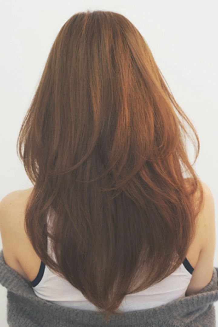 毛先を2〜3cmレイヤーカット。38mmのヘアアイロンで全体を内巻きにし、顔まわりの髪は外巻きに。