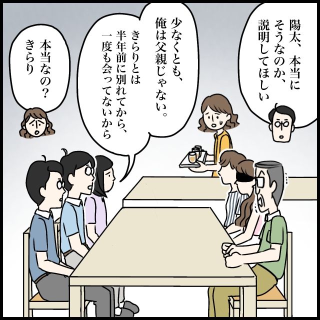 すると、「陽太、本当にそうなのか、説明してほしい」太一さんの言葉に、「少なくとも、俺は父親じゃない。きらりとは、半年前に別れてから、一度も会ってないから」陽太がそう言うと、「本当なの?きらり」とお母さんがたずねました。