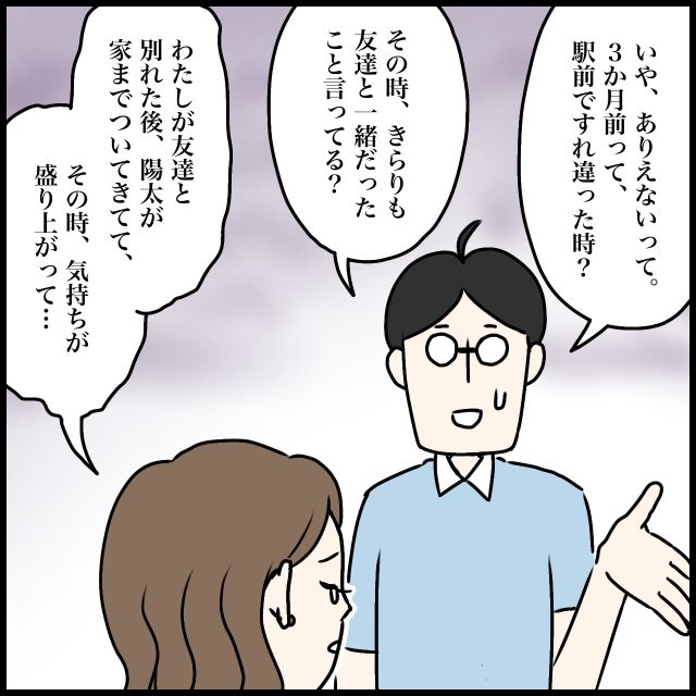 「いや、ありえないって。3か月前って、駅前ですれ違った時?その時、きらりも友達と一緒だったこと言ってる?」陽太がそう言うと、「わたしが友達と別れた後、陽太が家までついてきてて、その時、気持ちが盛り上がって・・」ときらりちゃんが言いました。