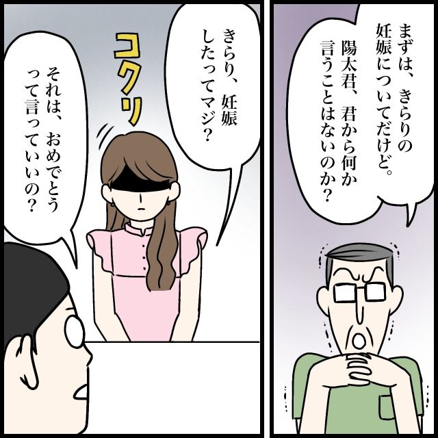 「まずは、きらりの妊娠についてだけど。陽太くん、君から何か言うことはないのか?」怒りに震えながらお父さんがそう言うと、「きらり、妊娠したってマジ?」と陽太がきらりちゃんに言いました。コクリとうなずくきらりちゃんに「それは、おめでとうって言っていいの?」陽太が続けて聞くと、
