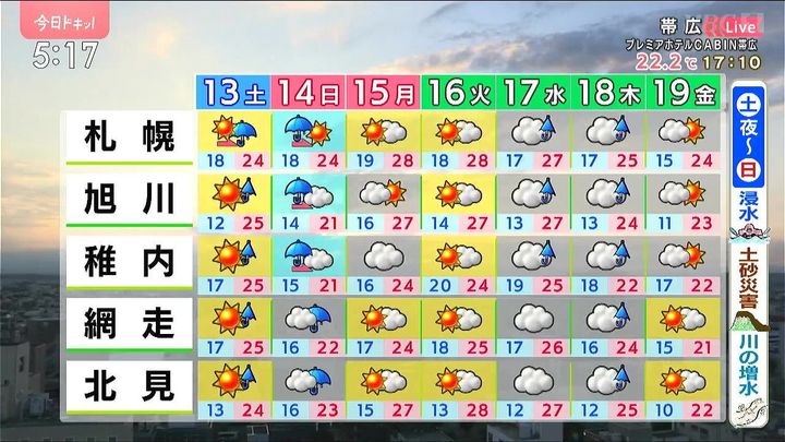※12日午後5時時点の情報です。最新の気象情報は、HBCウェザーセンターのホームページなどでご確認ください。HBCは気象庁の認可を2001年に得て以来、民間気象会社の一つとして「HBCの独自予報」を発信しています。