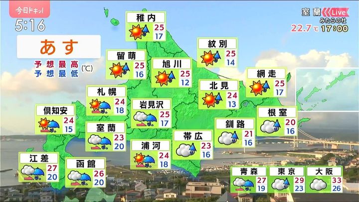 あす13日(土)は南風で、海から湿った空気が流れ込むため、室蘭では霧が、胆振の山沿いでは朝から小雨が降りそうです。