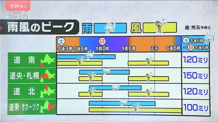 まずは雨から。道南はあす13日(土)夕方から、札幌など道央はあす夜から、どちらも日曜早朝にかけての暗い時間帯がピークとなります。道北や道東方面はあす夜9時以降から日曜午前にかけてが雨のピークです。土曜午後6時から日曜午後6時までの24時間に100ミリから道央の多いところで150ミリの大雨です。土砂災害などに注意して下さい。風のピークは2回あって、土曜の夜と雨のピークが過ぎた日曜の日中も注意が必要です。