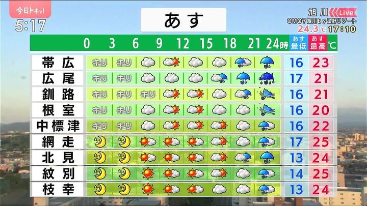 道東は霧がかかり、夜は雨が降るでしょう。傘がさせないほどの風も伴います。オホーツク海側は日中いっぱい晴れるでしょう。