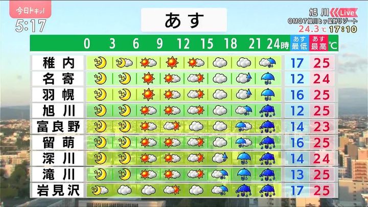 しだいに風が強まり、道南から雨が降り出すでしょう。朝は旭川で12度と冷える他は、今朝より3度ほど高くなります。日中は24度前後ですが、室内では少しムシムシしそうです。