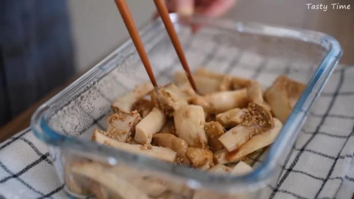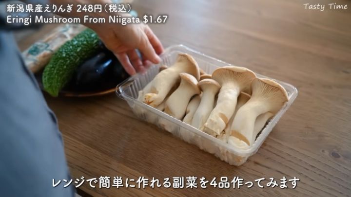 TastyTimeさんは電子レンジを使って副菜を作っていました。えりんぎを食べやすい大きさにカットし、電子レンジで加熱。砂糖、塩で下味をつけ、醤油、ごま油のほか、お好みでゆず胡椒や白ごまと和えて完成です。火を使わず調理できるので、「あと1品ほしい」というときにも手軽に作れます。