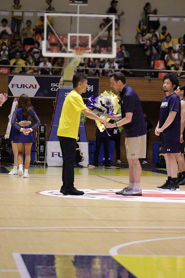 続いて、足利市長の早川尚秀氏より、宇都宮ブレックス コロネルHCに、昨シーズンのBリーグ優勝と、BCL Asia 2025優勝を祝福する花束等が贈呈されました。