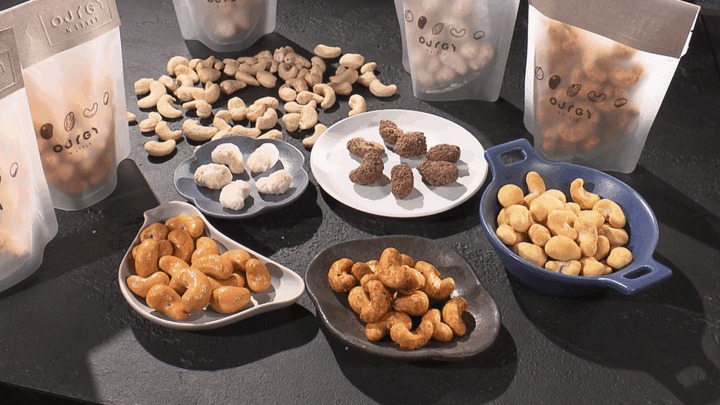 メーカーからの受注生産で経営してきた松福堂に転機が訪れたのはコロナ禍の2021年。メーカー向けの生産が落ち込む中、オリジナルブランドの「OJIGI N STYLE(オジギ・エヌ・スタイル)」を立ち上げ、ネット販売をスタートしました。創業以来初のチョコレートを使った商品を開発。中でも話題になったのが、妻の由季子さんと共に仕上げた「タコヤキナッツ」。タコを入れずに、たこ焼きを見事に再現しました。