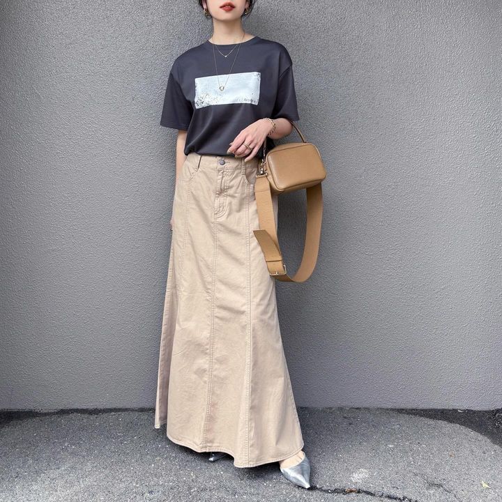 シルバーの箔プリントがコーデ全体を高見えに。スムース素材で着心地もなめらかです。やや長めの袖が二の腕をすっきり見せてくれるのも嬉しいポイント。合わせたのはナローフレアスカートとシルバーパンプス。さりげなく今っぽさを取り入れた、こなれ感たっぷりのカジュアルコーデです。