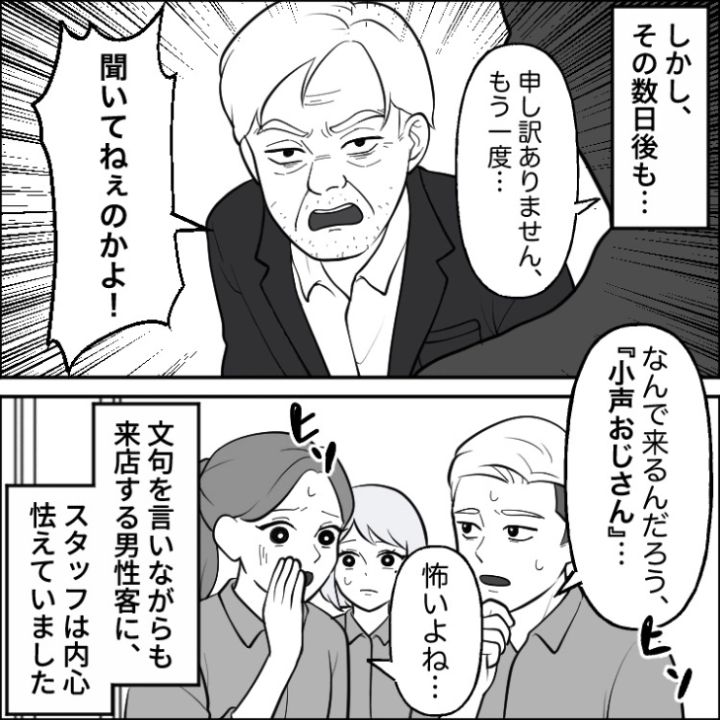 衝撃のエピソードを漫画化!今回は主人公のお店に度々やってくる「小声おじさん」という迷惑客のお話をご紹介します。小声おじさんはわざと小さい声で話して聞き返すと大声で怒鳴ってくるという迷惑客で・・・。