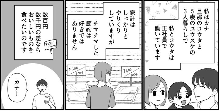 私はカナ(32)。旦那のコウタ(36)とユウスケ(5)の3人暮らしです。私とコウタは正社員で働いており世間では“パワーカップル”と言われるほどの年収です。ただ、贅沢するときはする、財布のひもをしめるときはしめる、とメリハリをつけて生活しています。ただ、チマチマした節約はストレスになるから好きではありません。する必要もないですしね。だから数百円、数千円の差ならおいしいものを食べたいと思うことは、当たり前のことだと思います。