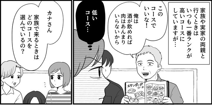 「カナさんたちは、よく来ているのよね? どのコースを選んでいるの?」と、様子を伺うように義母が私にたずねてきたので「いつもはプレミアムコースです」と言ってやりました。しかし、義父の独断で一番金額の安いコースに決められてしまいました。しかも注文係まで押し付けられて私はイラっとしてしまいます。