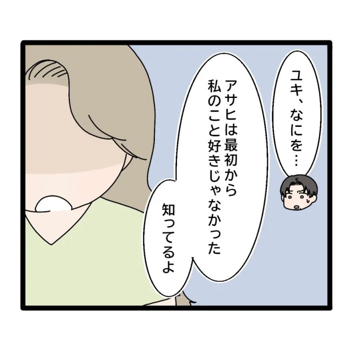 「ユキ、なにを・・」と言うアサヒさんに、「アサヒは最初から、私のこと好きじゃなかった。知ってるよ」ユキさんがそう言うと、
