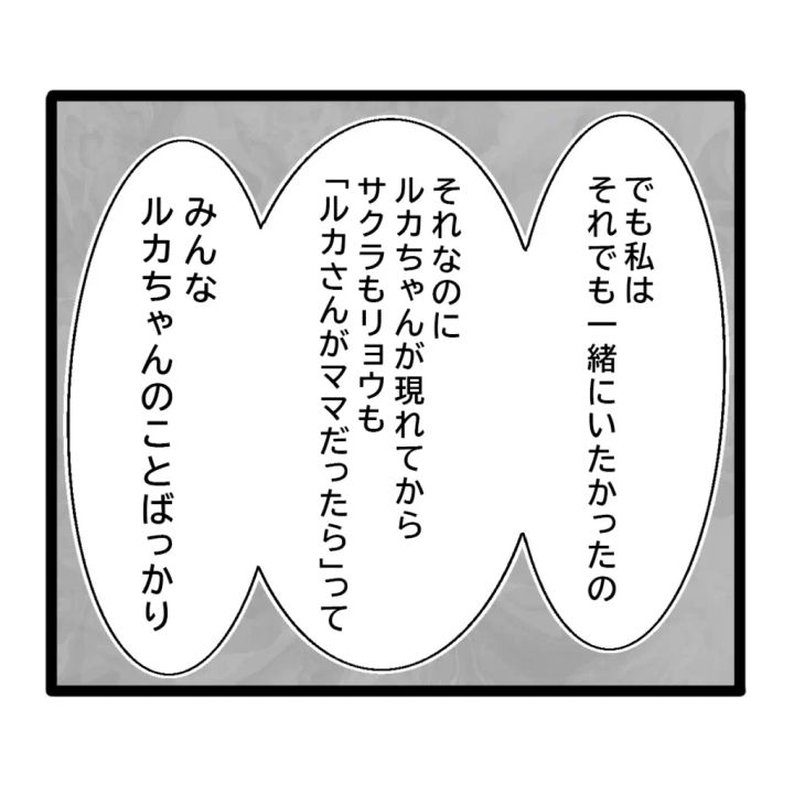 「でも私は、それでも一緒にいたかったの。それなのに、ルカちゃんが現れてから、サクラもリョウも『ルカちゃんがママだったら』って、みんなルカちゃんのことばっかり」